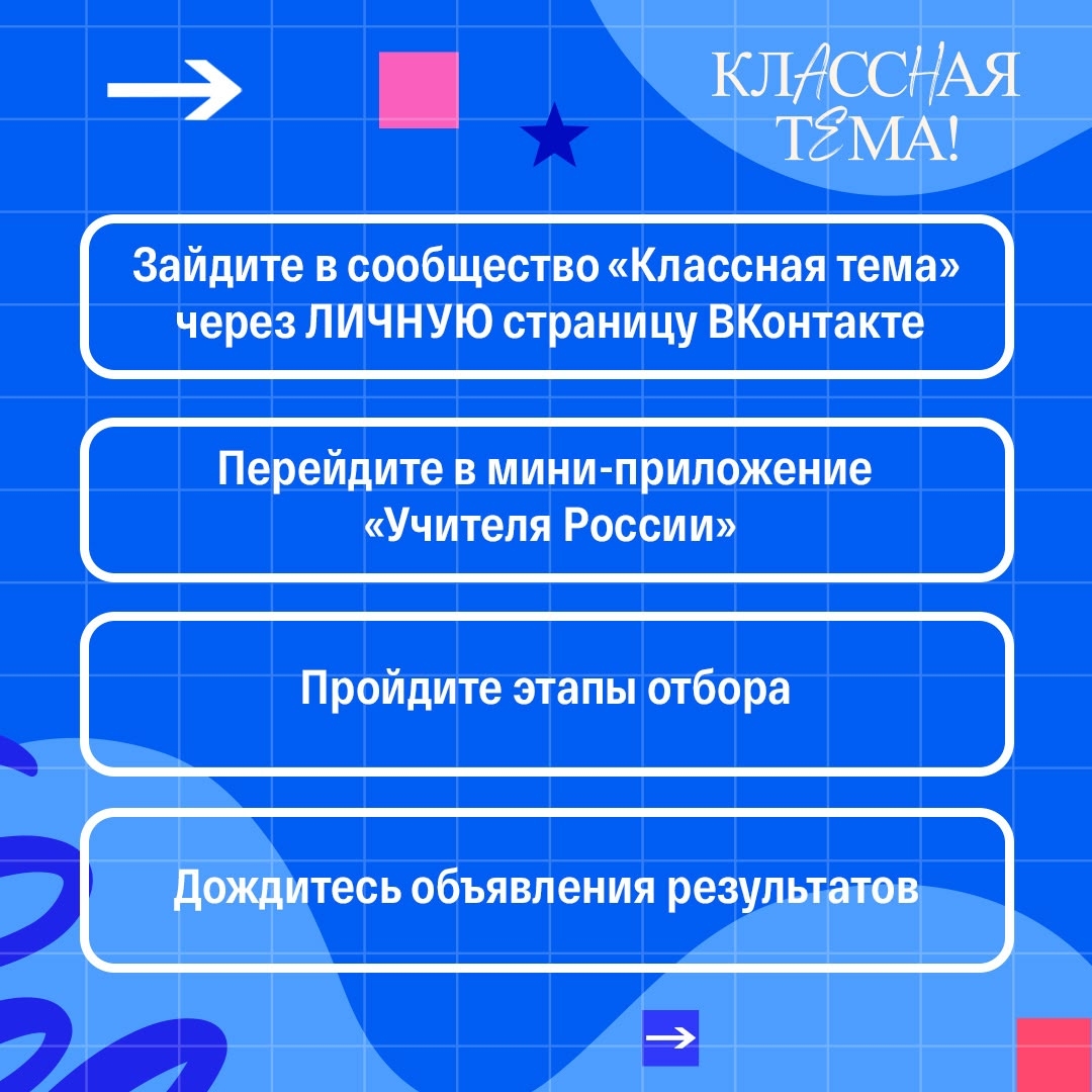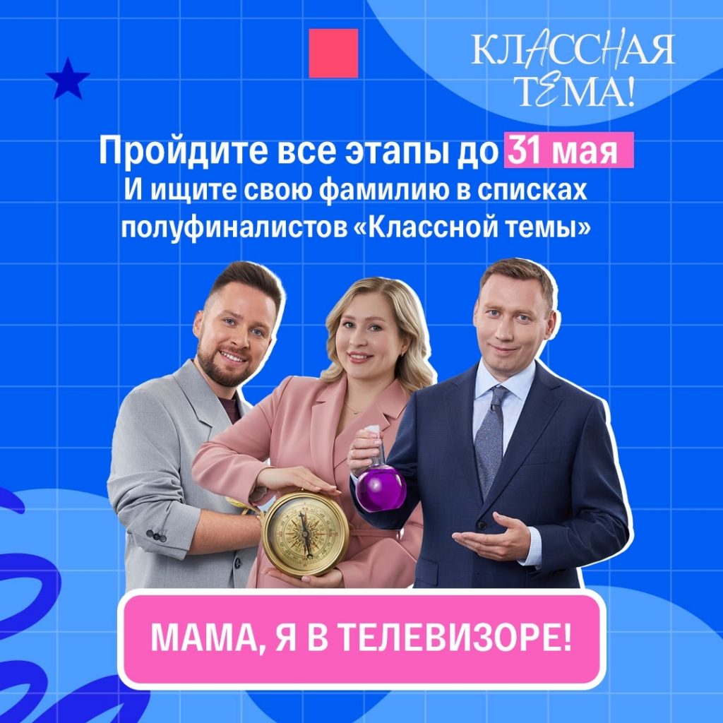 «Классная тема!» — телепроект, созданный по поручению Президента РФ Владимира Путина телеканалом «Россия 1» и Минпросвещения России при информационной поддержке компании VK. Проект, посвящённый современным учителям, призван представить самых ярких педагогов и повысить престиж одной из значимых профессий России. Победитель награждается возможностью представить авторскую программу на Федеральном телевизионном канале. Проект создан по нацпроекту «Образование».