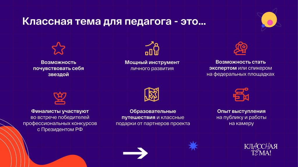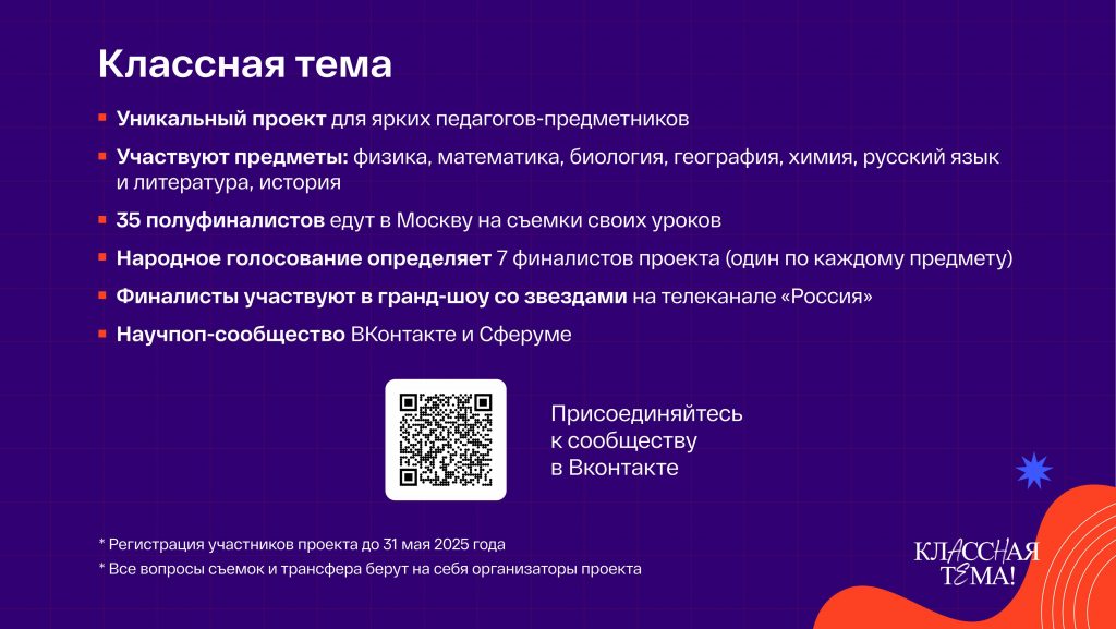 Подать заявку на участие в Форуме и пройти первые три этапа отбора можно до 31 мая 2025 года. Заявки принимаются в мини-приложении «Учителя России» в социальной сети «ВКонтакте» по ссылке: vk.com/app51730148.Дополнительная информация о Форуме доступна в официальном сообществе «ВКонтакте»: vk.vk.com/vfkr_ru.Телешоу «Классная Тема!»С 3 апреля 2025 года также запущен отбор участников для нового сезона популярного телешоу «Классная Тема!», проводимого Минпросвещения России совместно с телеканалом «Россия» при информационной поддержке компании «ВКонтакте». Проект направлен на популяризацию профессии педагога и развитие их профессиональных компетенций.В этом году, наряду с педагогическими работниками общеобразовательных организаций, к участию в отборе приглашаются педагогические работники организаций СПО, преподающие следующие предметы: математика, химия, биология, география, история, физика, русский язык.Подать заявку на участие во Всероссийском отборе «Классная Тема!» можно до 31 мая 2025 года. Заявки принимаются через мини-приложение в социальной сети «ВКонтакте» по ссылке: vk.com/app51730148.Официальное сообщество Всероссийского отбора «Классная Тема!» в социальной сети «ВКонтакте»: vk.com/klassnayatemashow.
