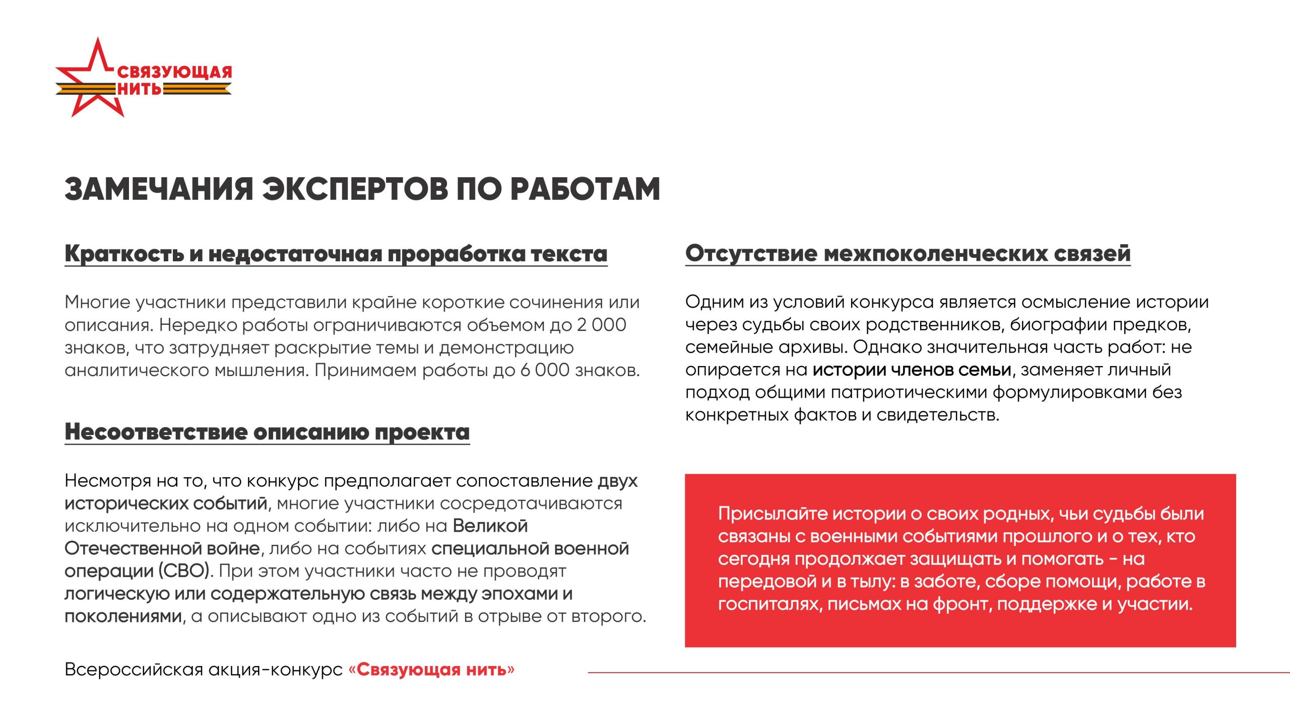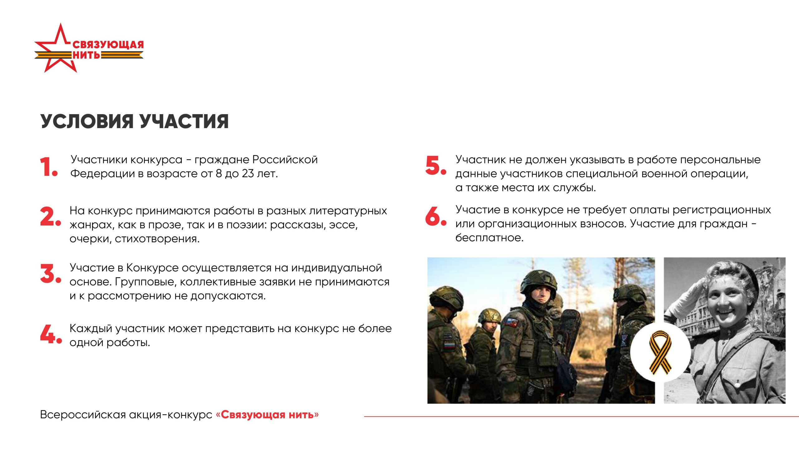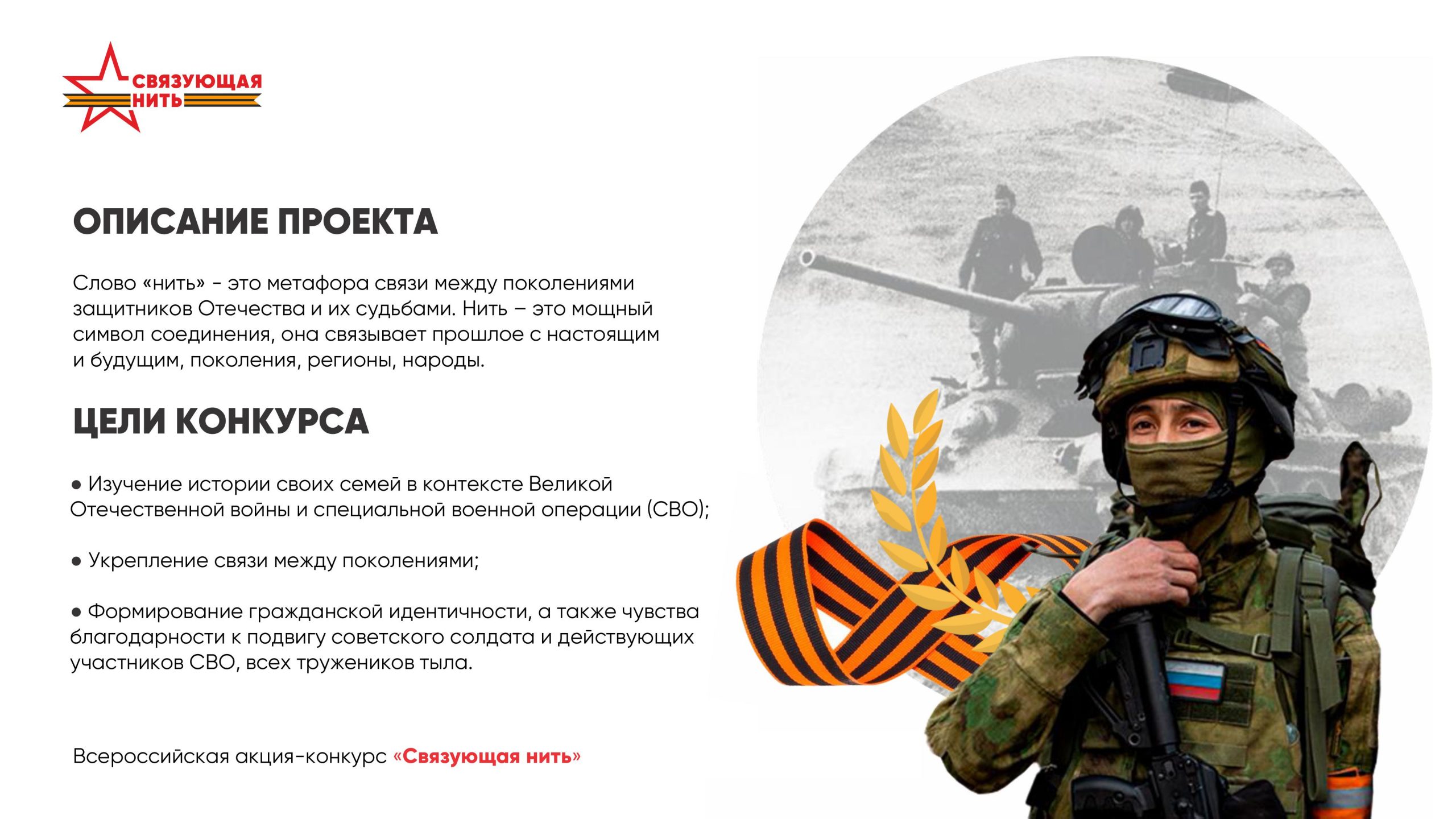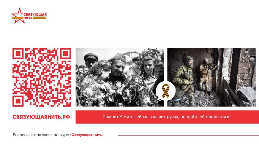 «Связующая нить» – это не просто рассказ о подвиге, а история о семейной силе, которая не рвётся. О том, как память живёт не в архивах, а в поступках — через поколения. Именно поэтому так важно, чтобы в конкурсной работе было не одно событие, а два: два человека, две судьбы. Один герой — из прошлого: участник Великой Отечественной войны, труженик тыла, ветеран. Другой — из настоящего: участник СВО, волонтёр, ваш родственник или даже вы сами.