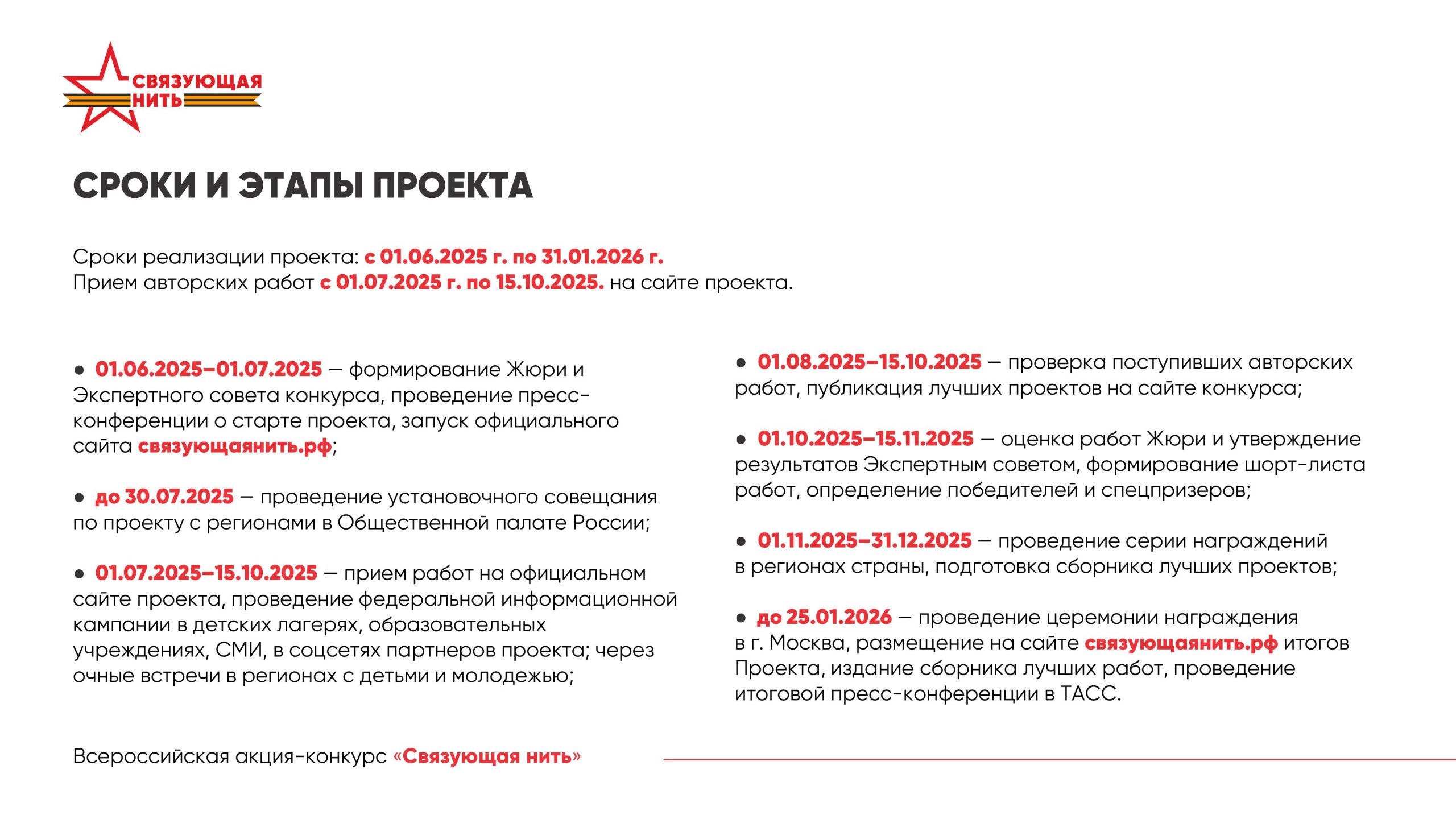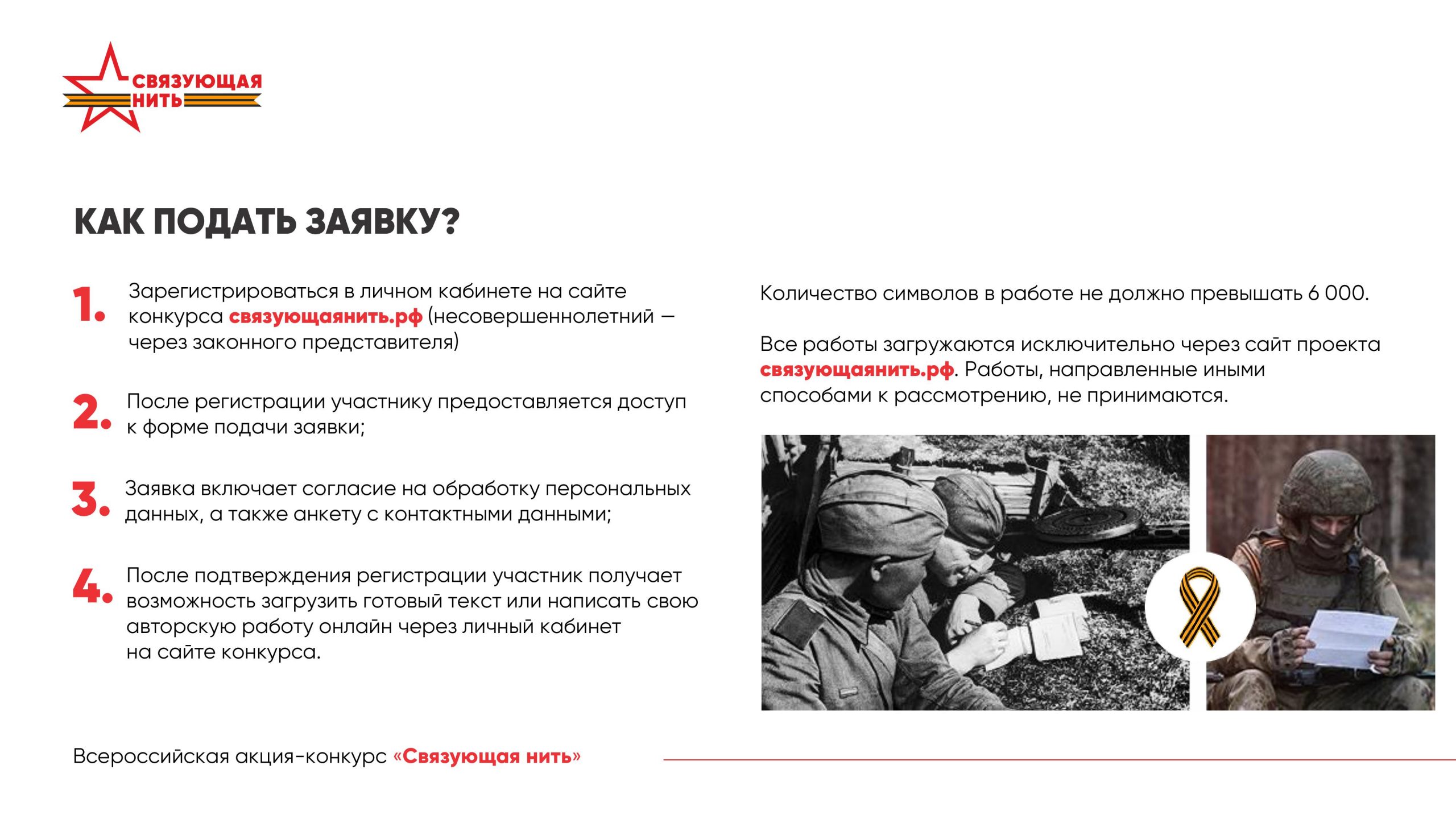 Для участия в конкурсе переходите на сайт связующаянить.рф, загружайте свою работу в личном кабинете в срок до 15 октября 2025 года.