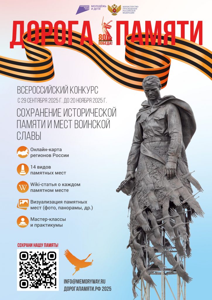 В 80-ую годовщину Победы в Великой Отечественной войне в рамках национального проекта «Молодежь и дети» и федерального проекта «Мы вместе» при поддержке Министерства просвещения Российской Федерации проводится всероссийский конкурс «Дорога Памяти. Сохранение исторической памяти и мест воинской славы».