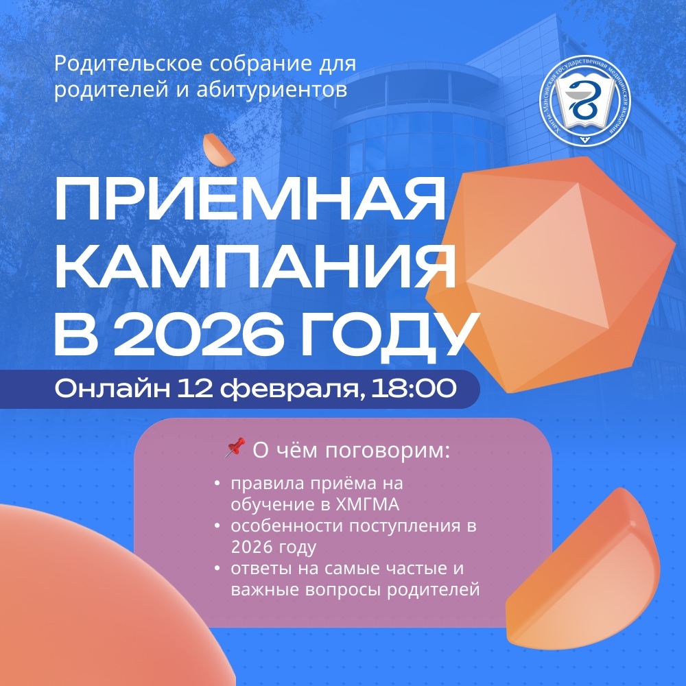 Ханты-Мансийская государственная медицинская академия приглашает родителей будущих абитуриентов на онлайн-собрание, посвящённое приёмной кампании 2026 года.