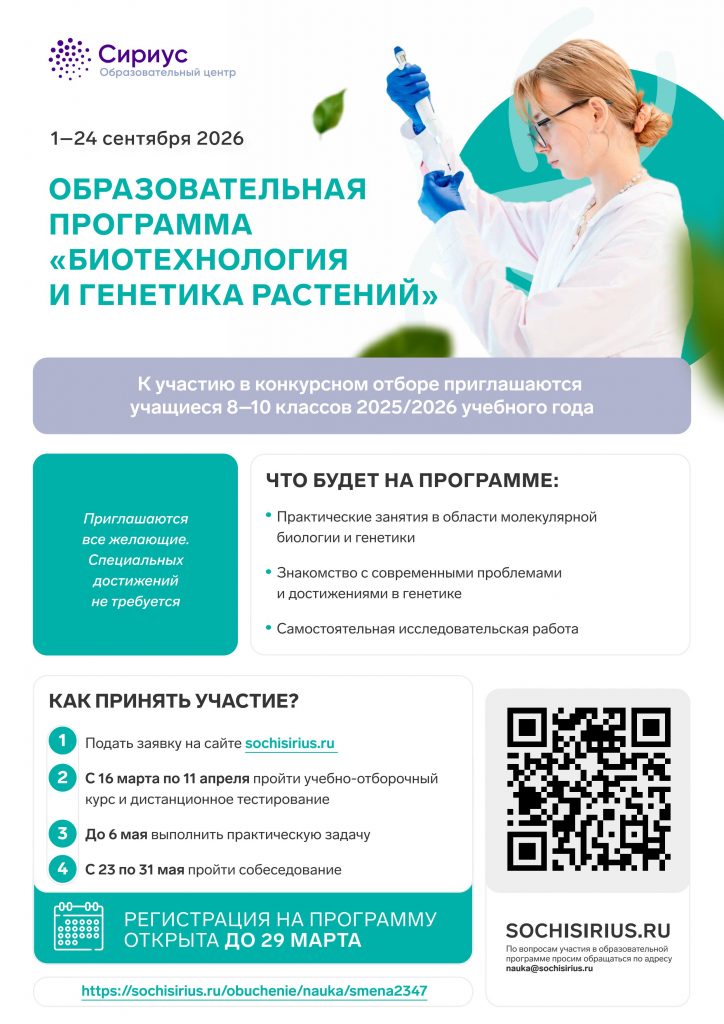 Образовательный центр «Сириус» объявляет старт конкурсного отбора на уникальную интенсивную профильную программу «Биотехнология и генетика растений»!